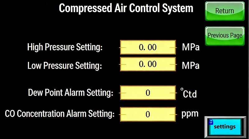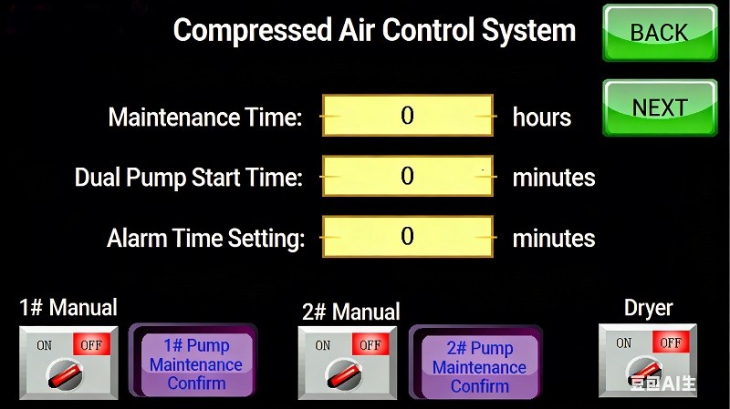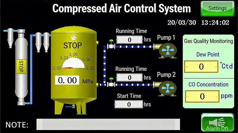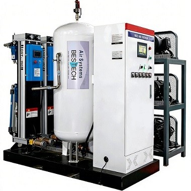 The BT-GA series air compressor unit complies with CE and ISO13485 standards and includes two or more oil-free scroll compressors (multiple in operation, one as backup). The system is suitable for three-phase power supply, 380V, 50Hz operating environment. It employs PLC and touchscreen control, and is equipped with a three-stage filtration system, an automatic drain valve (eliminating the need for manual drainage), an adsorption dryer, two pressure sensors (one in operation, one as backup), a pressure dew point alarm, a carbon monoxide concentration alarm, manual ball valves, check valves, an automatic control box, a 300-liter carbon steel buffer tank, and a connecting piping frame, etc.